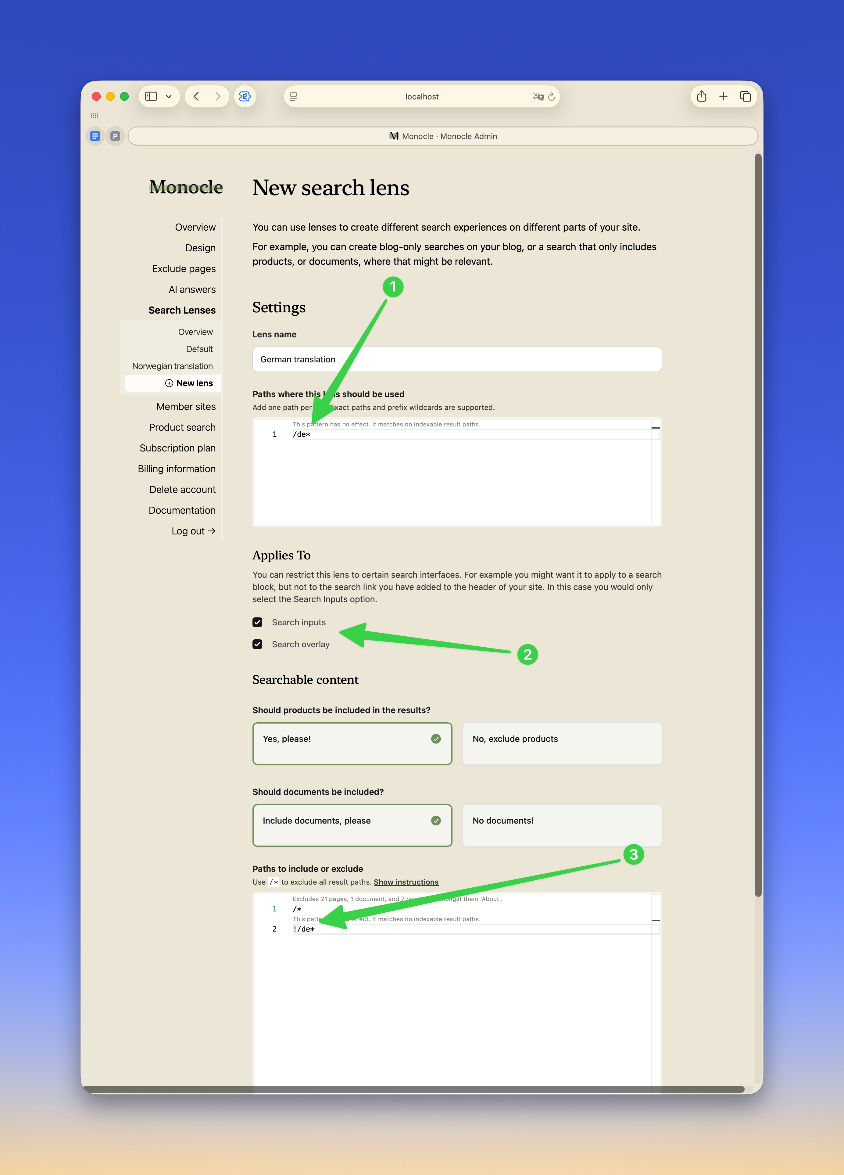 Paths where this lens should be usedto/de*. Use/de*, not/de, so the lens applies to the full German section and not only the root page. - Enable the search surfaces that should use the German lens. If both